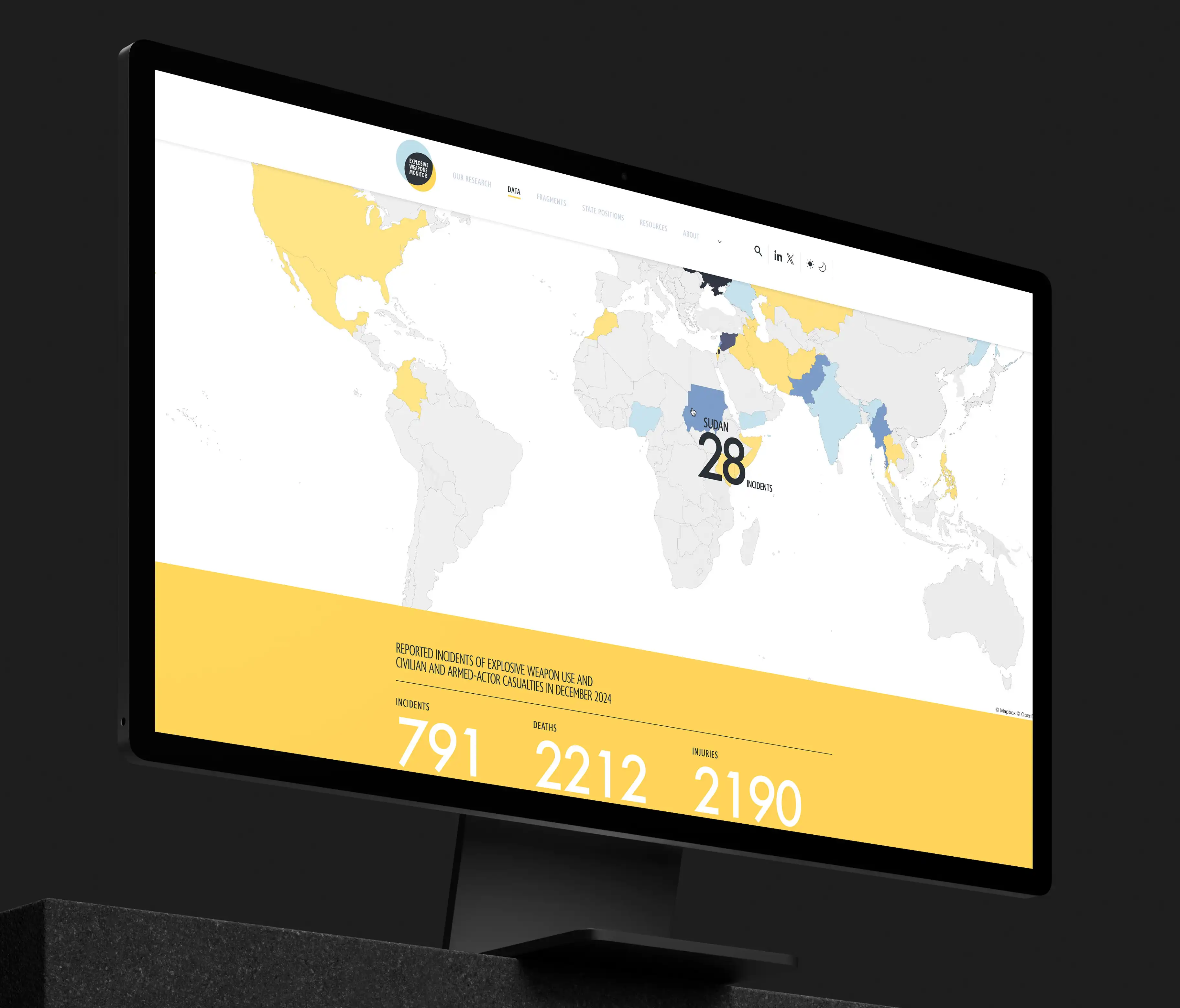 Fully responsive site powered by a bespoke headless CMS, designed around EWM's process of publishing monthly reports on civilian harm from explosive weapons around the world.